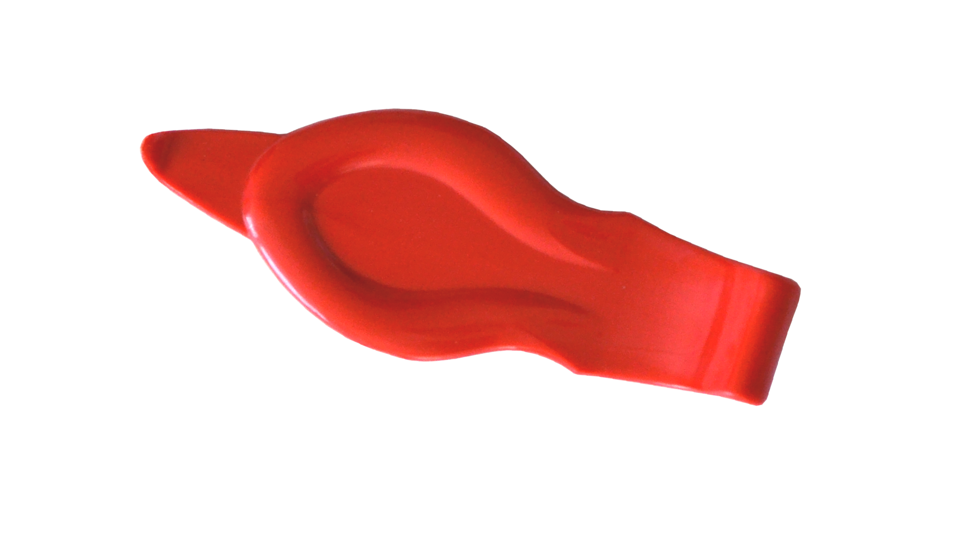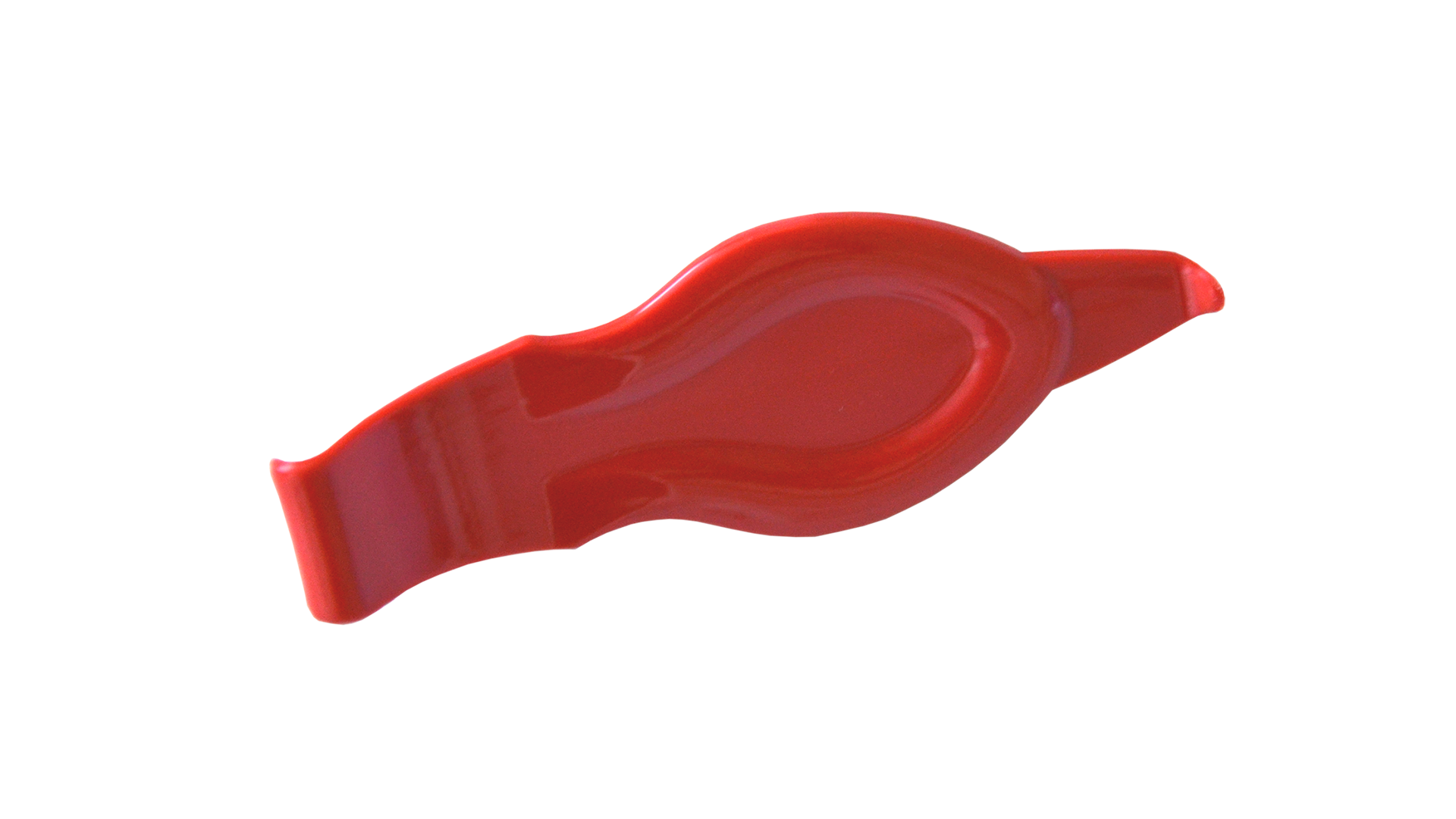 Rote Kunststoffrakel mit zwei unterschiedlich gebogene Haken zum besseren Verkleben von Folien an Problemzonen wie Ecken, Kanten und Sicken.