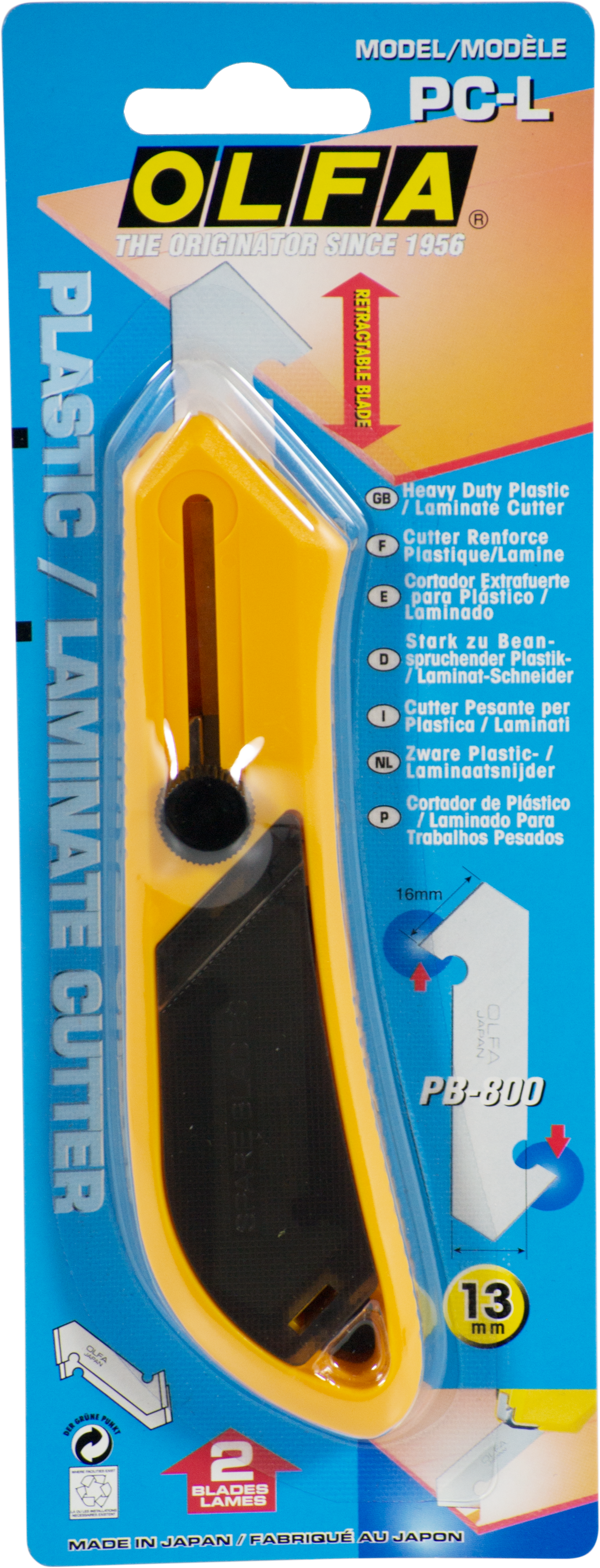 Dieses Messer für anspruchsvolle Aufgaben wurde entworfen, um eine feine Sollbruchstelle zu erzeugen, mit der Kunststoff, dicke Kartons, Acrylplatten und Laminat gebrochen werden kann. Das OLFA® PC-L verfügt über einen eingebauten Ersatzklingenspender, der im Griff integriert ist. Das Sperrrad ist so konstruiert, dass die Klinge sicher ein- und ausgefahren werden kann und lässt so zahlreiche Klingepositionen zu. Im Lieferumfang ist die doppelseitige PB-800-Klinge enthalten sowie 2 Ersatzklingen, die im Griff untergebracht sind.